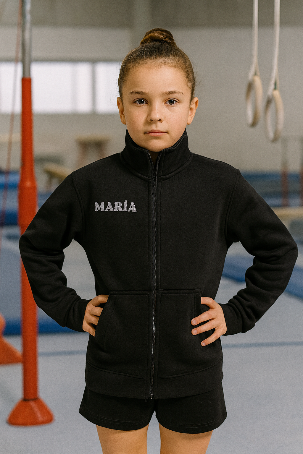 Dos bolsillos laterales con ribete del mismo tejido. Puños y cinturilla con elastano.